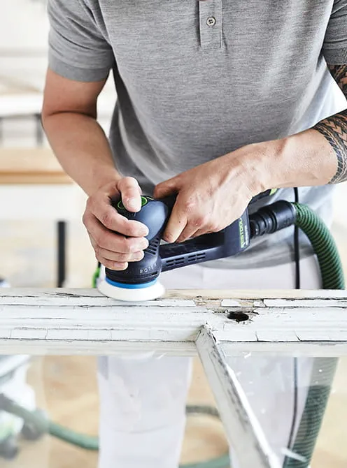Este ejemplo de aplicación explica claramente cómo se pueden lijar ventanas y proteger el cristal al mismo tiempo utilizando el sistema de protección de Festool. Se describen los procesos de lijado fino y grueso, tanto en superficies como en esquinas. Ir al ejemplo de aplicación -