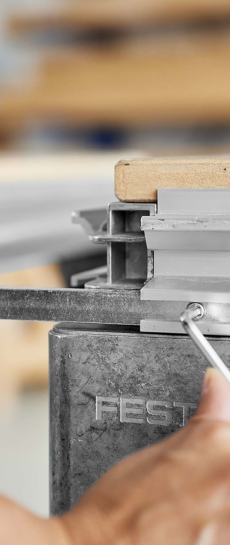 Con los accesorios adecuados, la MFT/3 se convierte en un banco de trabajo a medida: Molduras, listones y maderas de armazón pueden entallarse de forma segura y rápida.