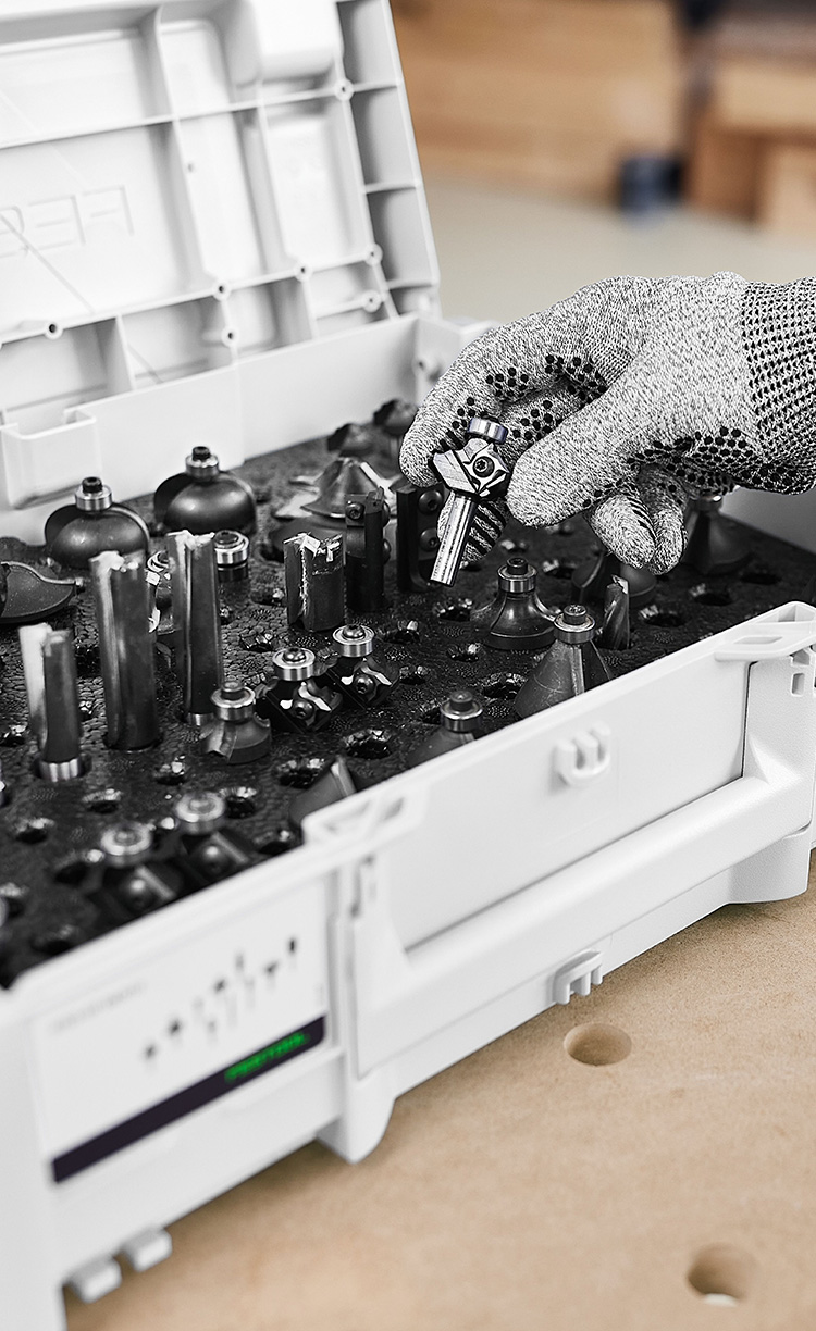 Ya sea a ras, con radios, fresas de ranuras o perfiles especiales; tenemos la fresa perfecta para tu proyecto. Nuestras fresas tienen los filos de corte más afilados. Y cuando se desafila el primer filo de la fresa con plaquitas giratorias, se puede seguir utilizando simplemente girándola. Las gamas de fresas pueden guardarse bien protegidas en el práctico Systainer³ con ranuras individuales o en la caja de fresas. Con todo siempre a la vista y a mano.
