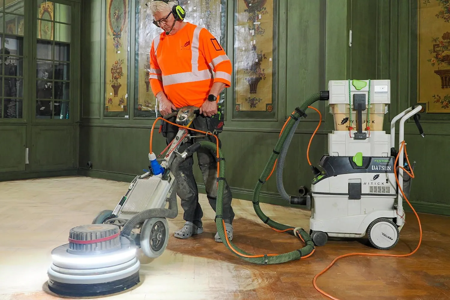 Esta combinación de extracción eficaz del polvo y Purificador de aire hizo posible llevar a cabo el exigente trabajo de renovación de una forma valiosa, que cumple las normas más estrictas del mundo laboral, tanto en el pasado como en la actualidad.Refinamiento de un entorno valioso: aceitado con la lijadora ETSC 2