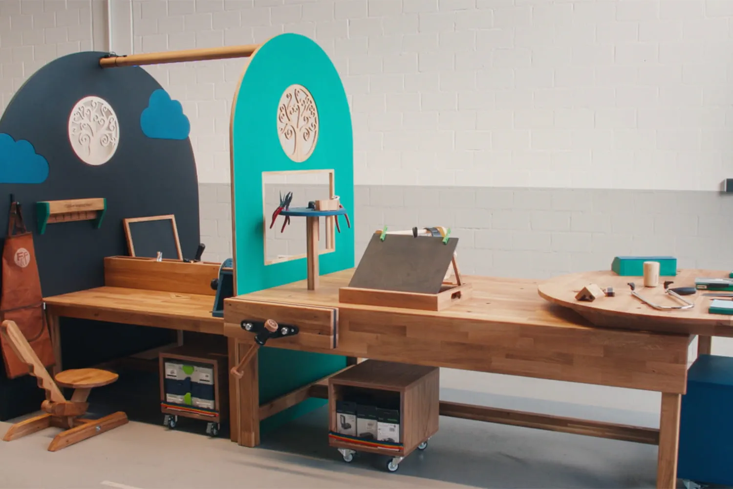 El banco de trabajo infantil impresiona por su estudiado diseño y ofrece una generosa superficie de trabajo con dispositivos de sujeción, herramientas integradas y Módulos móviles sobre ruedas. Un pequeño tablero invita a los niños a dibujar y hacer bocetos, ideal para las manos creativas de los niños. Destaca especialmente el Pared dorsal verde con un motivo de árbol, que confiere al mueble un carácter lúdico y simbólico.El resultado demuestra de forma impresionante cómo la pasión, el trabajo en equipo y las herramientas de alta calidad pueden dar como resultado un producto funcional e inspirador para los niños.
