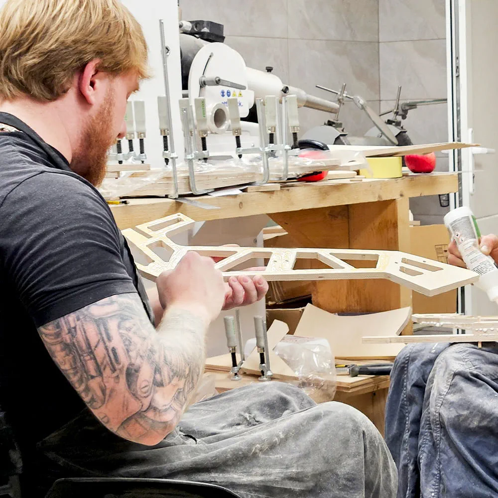 Paso a paso, se crean sillas de ruedas personalizadas a partir de paneles de madera y componentes individuales. Pero el objetivo del proyecto es algo más que una ayuda acabada. El trabajo en el taller también pretende dar a los participantes una estructura en su vida cotidiana, una nueva motivación y un objetivo claro.