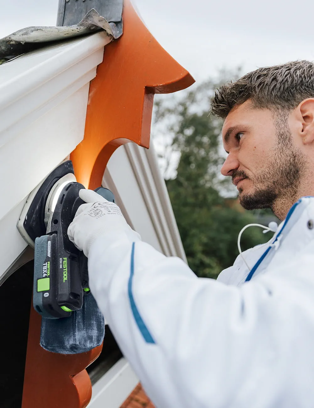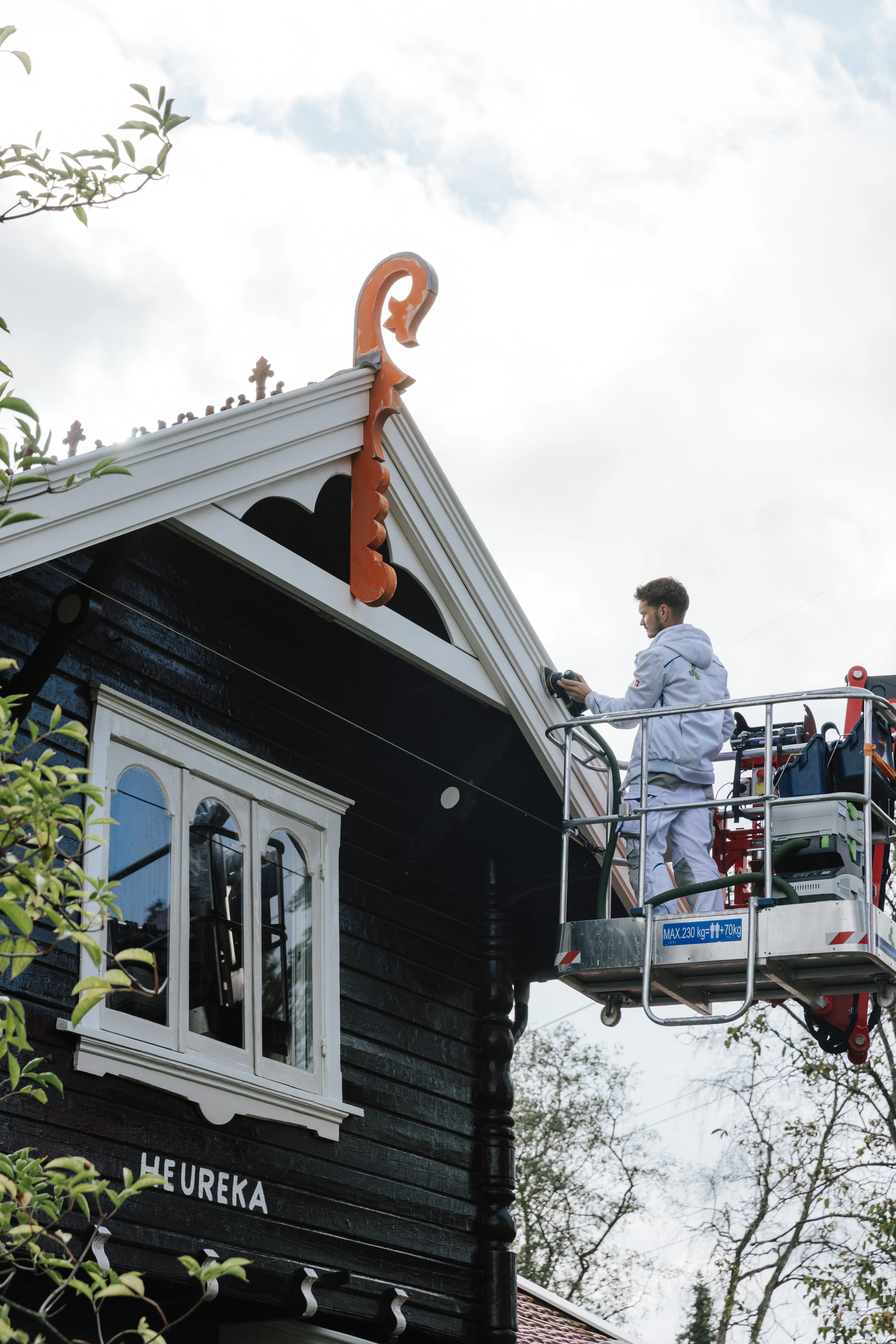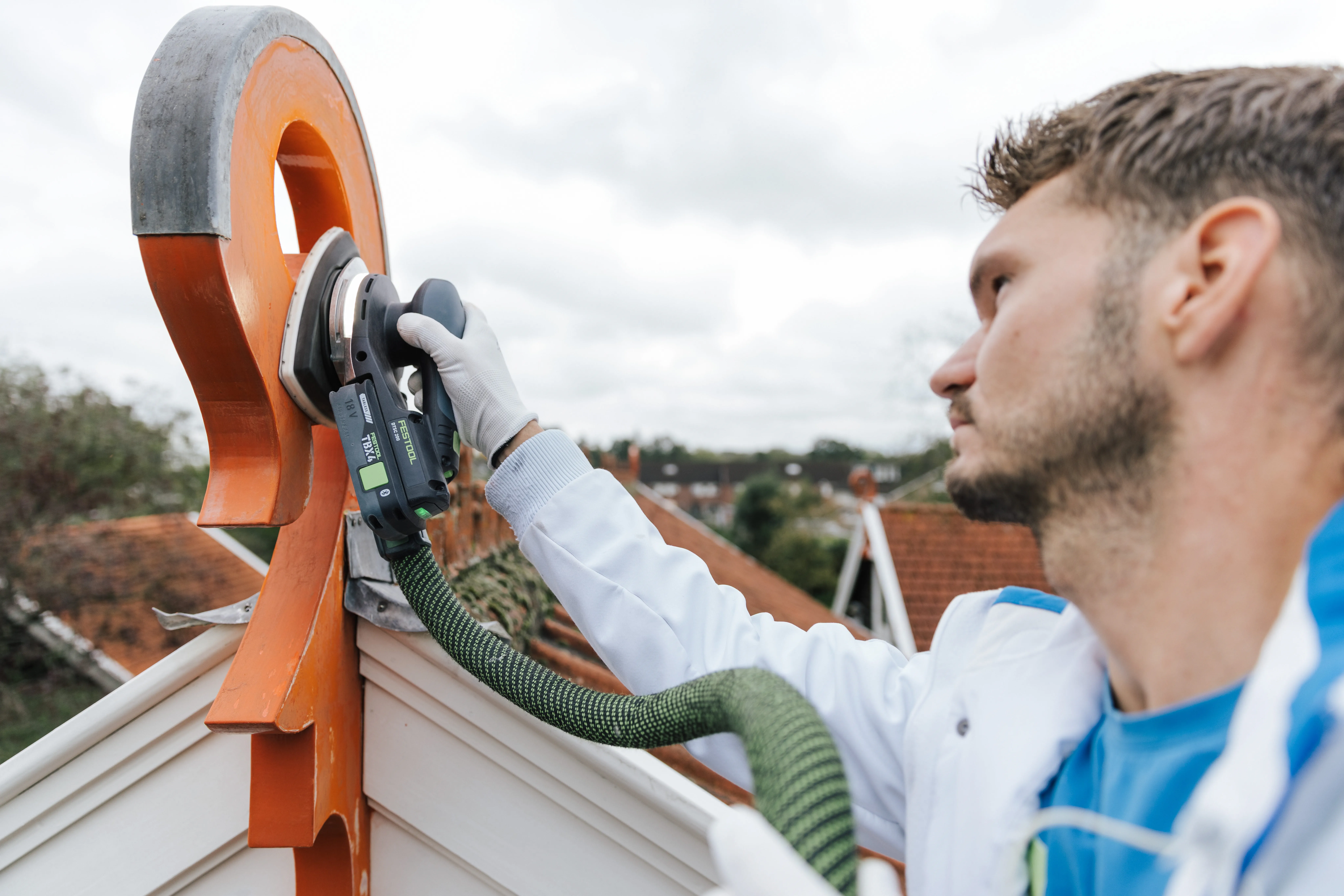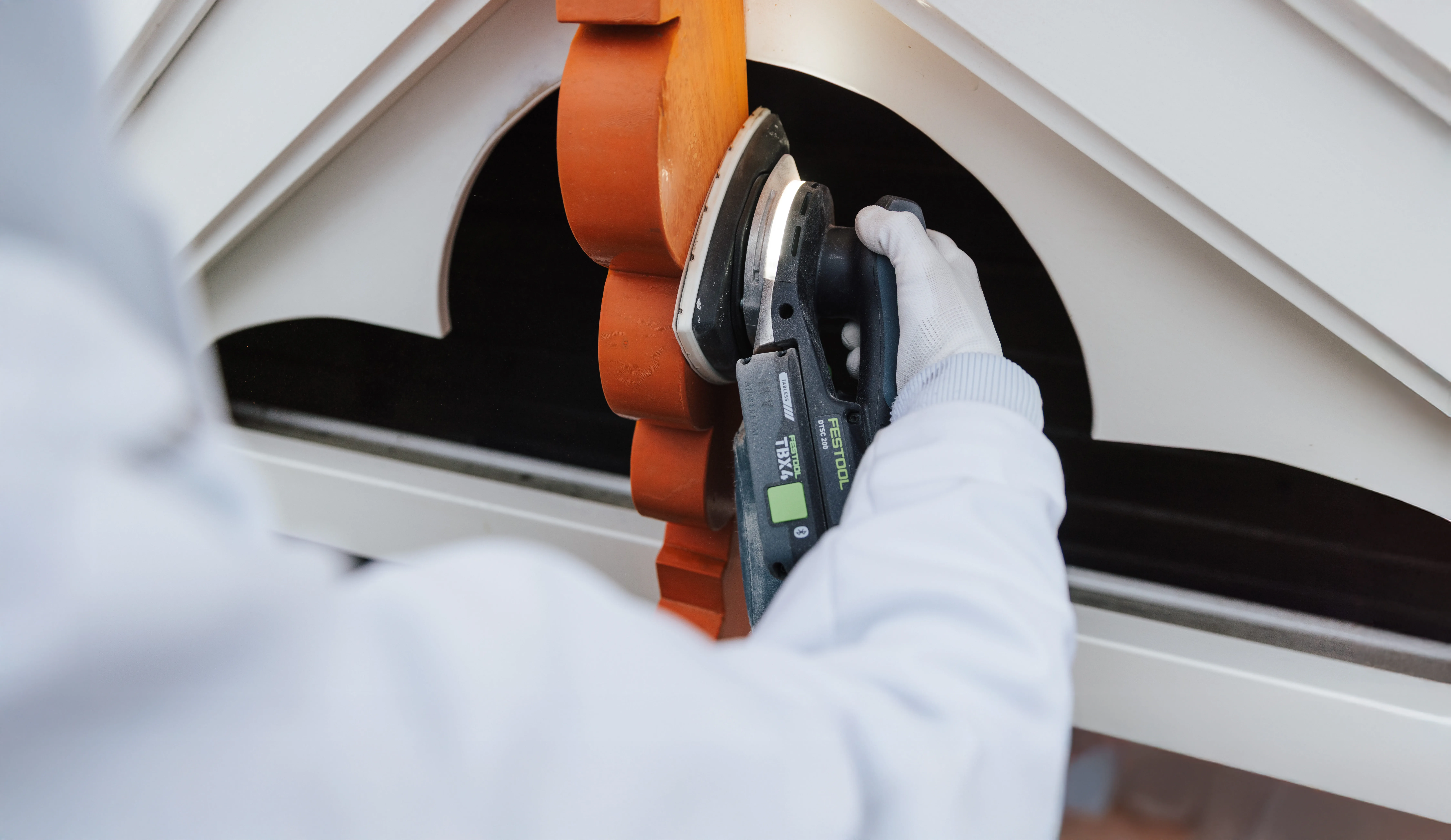 El lugar de trabajo favorito de Luke de Jager es en lo alto del Steiger. Está lijando con cuidado la característica ornamentación del tejado, que está entronizada en la cumbrera en un tono naranja apagado. La superficie de madera está desgastada y el revestimiento ya se está desprendiendo. Con la Lijadora Delta DTSC 200, Luke también consigue superficies curvas, perfiladas y cónicas. Cuando las cosas se ponen especialmente angulosas, utiliza la DTSC 400.