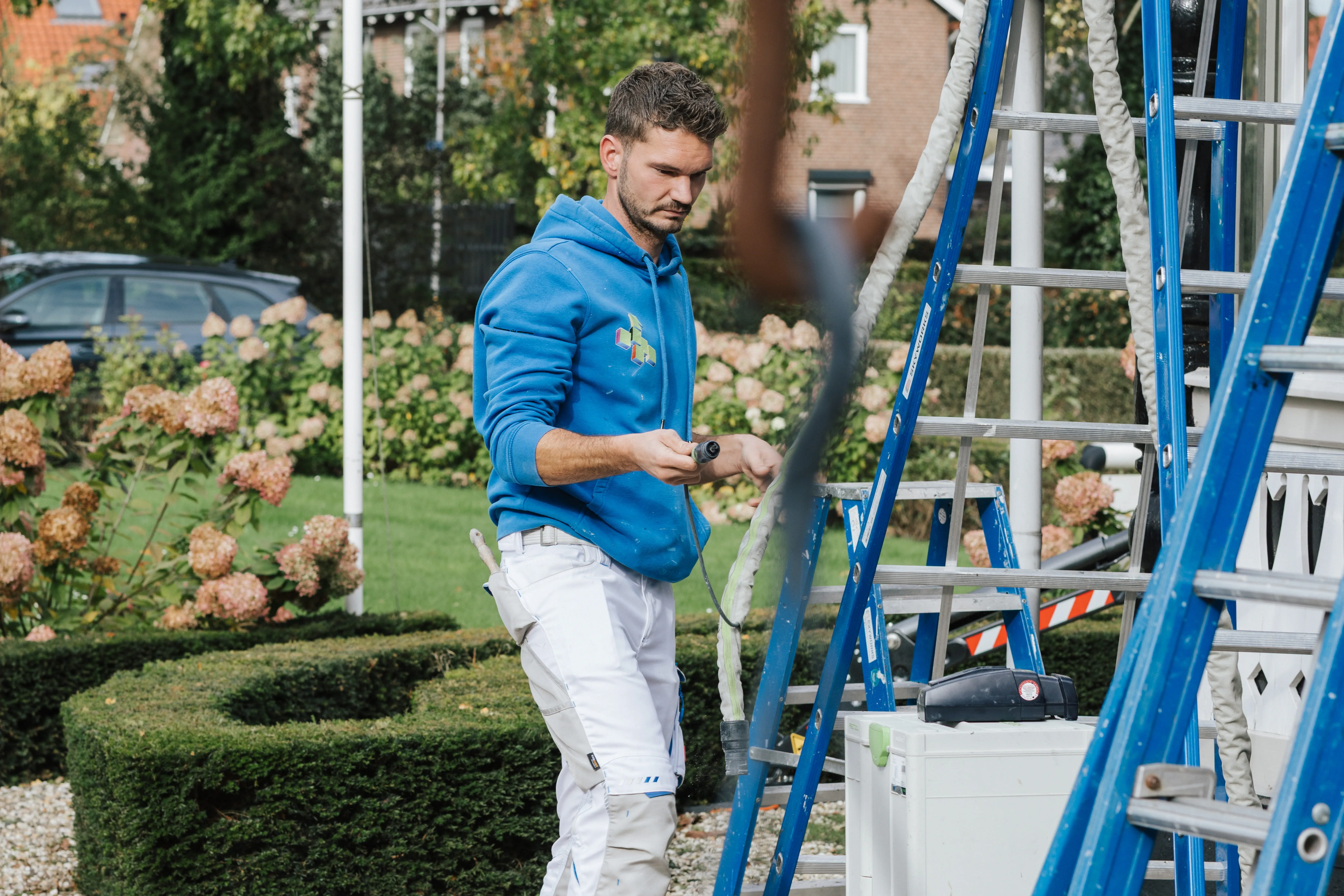 El joven pintor concede gran importancia al trabajo al aire libre en la contrahuella con un extractor de polvo o una Bolsa colectora de polvo. Porque así puede trabajar de forma más limpia y protegerse. "Muchos de mis colegas lo subestiman cuando trabajan en el exterior", dice desde arriba. "Pero aquí en Holanda siempre hay ráfagas de viento que, en el peor de los casos, te lanzan polvo a la cara cuando estás lijando".