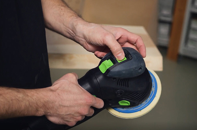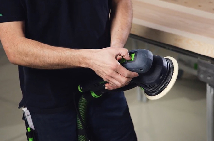 Durante el lijado fino, las marcas de lijado resultantes deben lijarse para que dejen de ser visibles tras el tratamiento de la superficie. Para ello, inicialmente se deja el grano P120 en la máquina. El Rotex pasa al movimiento excéntrico (lijado fino). A continuación, se eliminan las marcas de lijado del lijado basto. También en este caso se trabaja con un movimiento transversal.