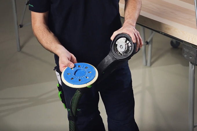 El disco de la Rotex puede cambiarse muy rápidamente mediante la interfaz FastFix. Para ello, desconecta primero el enchufe de la red y, a continuación, coloca el conmutador en lijado basto. A continuación se acciona el tope del eje. A continuación se gira el disco en sentido antihorario sin herramientas.