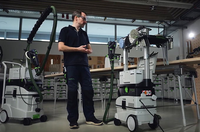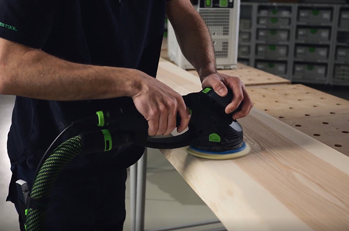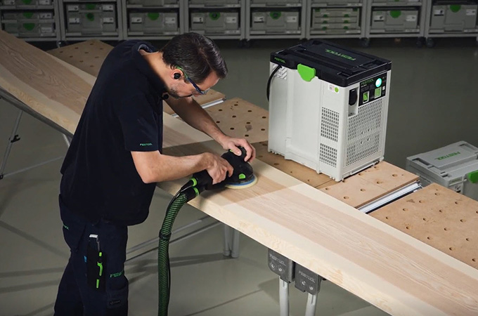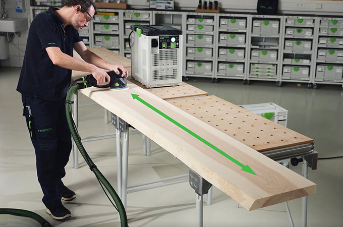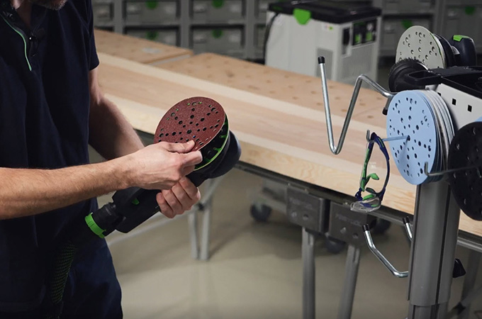 Las superficies de madera cepillada tienen las llamadas marcas de cuchilla, también conocidas como marcas de cepillado, causadas por las cuchillas de cepillar. Hay que lijarlas antes de recubrir la superficie. El resultado es una superficie más lisa y homogénea, y el revestimiento superficial tiene mejor agarre o puede penetrar mejor en la madera. Si no tienes una gran lijadora fija, este paso se puede realizar con una lijadora manual. La ROTEX es ideal para esto porque combina el lijado basto y el lijado orbital aleatorio en una sola máquina. Como este trabajo se realiza principalmente en el taller, es ventajoso acondicionar el lugar de trabajo en consecuencia. Por eso nos gustaría echar un breve vistazo aquí a los accesorios de nuestro sistema.