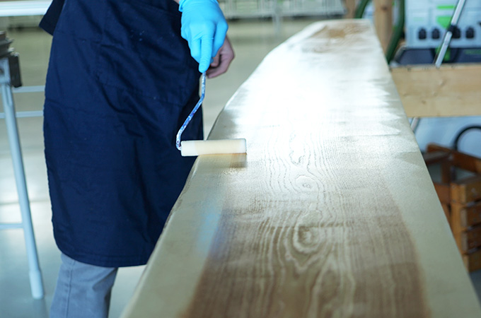 Para maderas como el roble, tiene sentido regar la superficie antes del lijado final. Para ello, humedece la superficie con una esponja o paño húmedos. Las fibras de la madera se levantan y pueden nivelarse con un lijado fino final después del secado. Durante el lijado intermedio tras la primera capa superficial, estas fibras ya se cortan y la superficie queda aún más lisa. El remojo también es una gran ventaja cuando se trabaja con tintes.