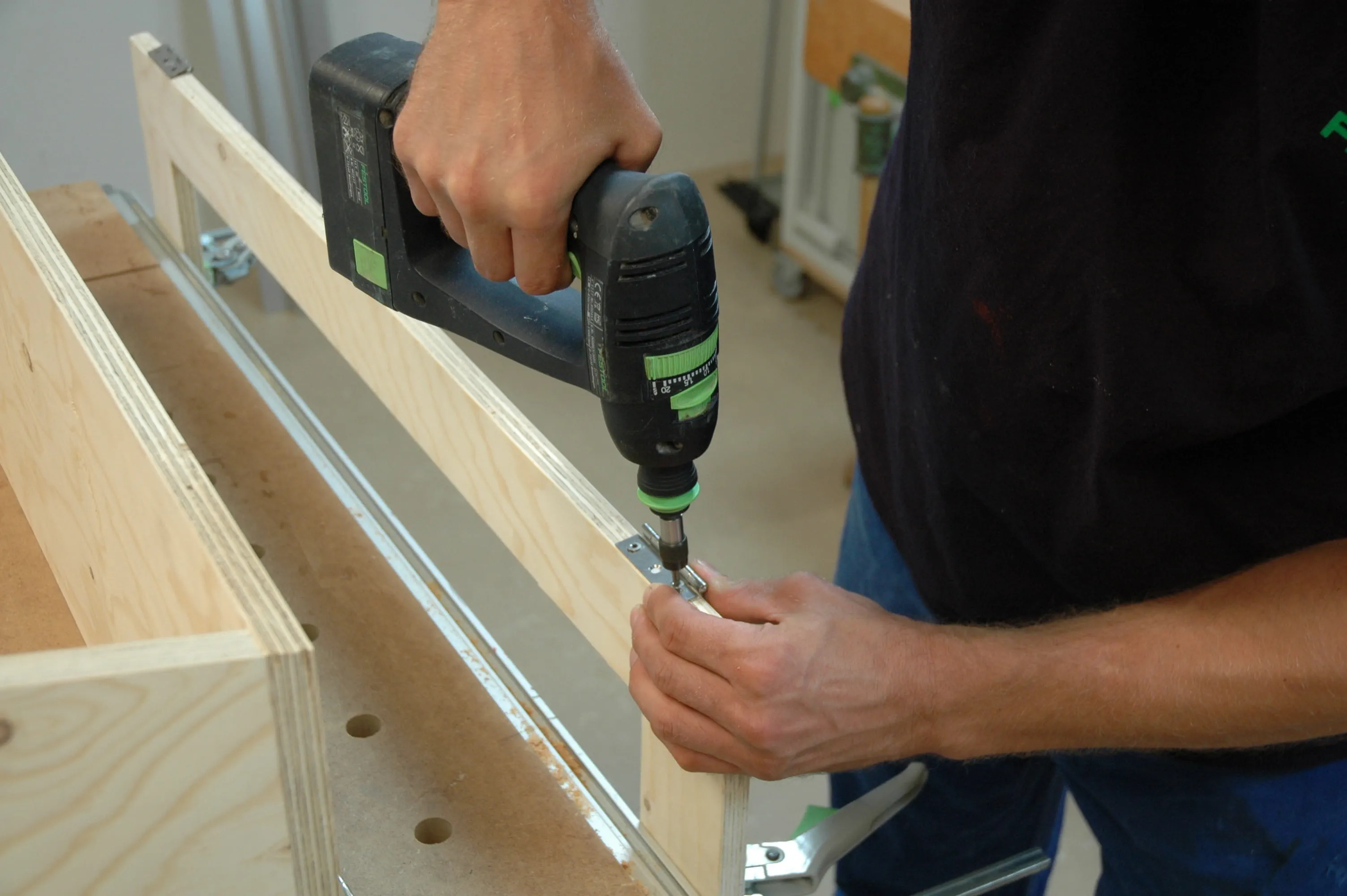 Las cuatro piezas para el bastidor abatible se unen con tacos. Si es posible, se recomienda emplear tacos (8 mm x 40 mm) de madera resistente al agua (roble, Sipo). Los orificios para la unión con tacos se taladran con una plantilla sencilla.